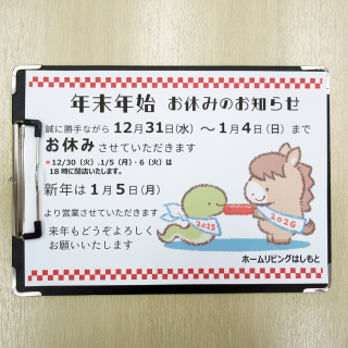 *12/30(火)・新年1/5(月)・6(火)は18時に閉店いたします。