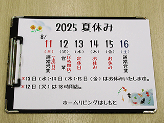 8月13日(水)・14日(木)・15日(金)はお休みいたします。